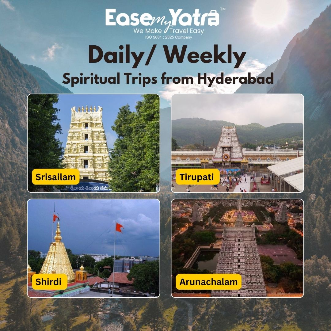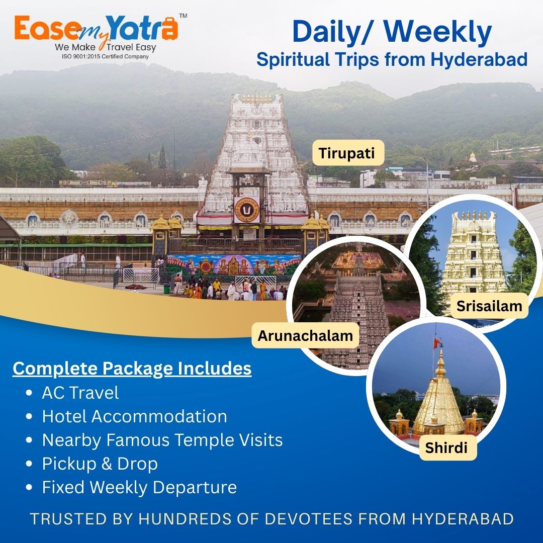 Looking for peaceful spiritual getaways from Hyderabad? Easemyyatra brings you comfortable, well-planned daily and weekly pilgrimage tours to South India’s most sacred temples. We handle everything – transport, darshan planning, accommodation (if required), and private transfers – so you can focus only on devotion.
