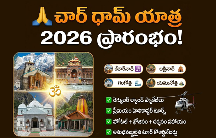 కేదార్‌నాథ్ | బద్రీనాథ్ | గంగోత్రి | యమునోత్రి ఈసారి మీ ఆధ్యాత్మిక ప్రయాణాన్ని ప్రత్యేకంగా మార్చుకోండి! ✅ రెగ్యులర్ ల్యాండ్ ప్యాకేజీలు ✅ ప్రీమియం హెలికాప్టర్ టూర్స్ ? ✅ హోటల్ + భోజనం + దర్శనం సహాయం ✅ అనుభవజ్ఞులైన టూర్ కోఆర్డినేటర్లు కుటుంబంతో కలిసి దైవానుభూతి పొందే అవకాశం!